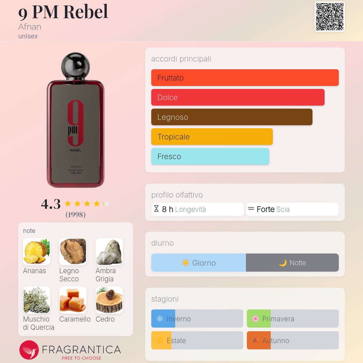 9 PM Rebel di Afnan è una fragranza del gruppo Aromatic Fruity unisex. È una nuova fragranza. 9 PM Rebel è stato lanciato sul mercato nel 2024. Il Naso di questa fragranza è Gaël Montero. Le note di testa sono Ananas, Mela Granny Smith e Mandarino; le note di cuore sono Muschio di Quercia, Legno di Cedro e Vaniglia; le note di base sono Legno Secco, Ambra Grigia, Caramello e Muschio.