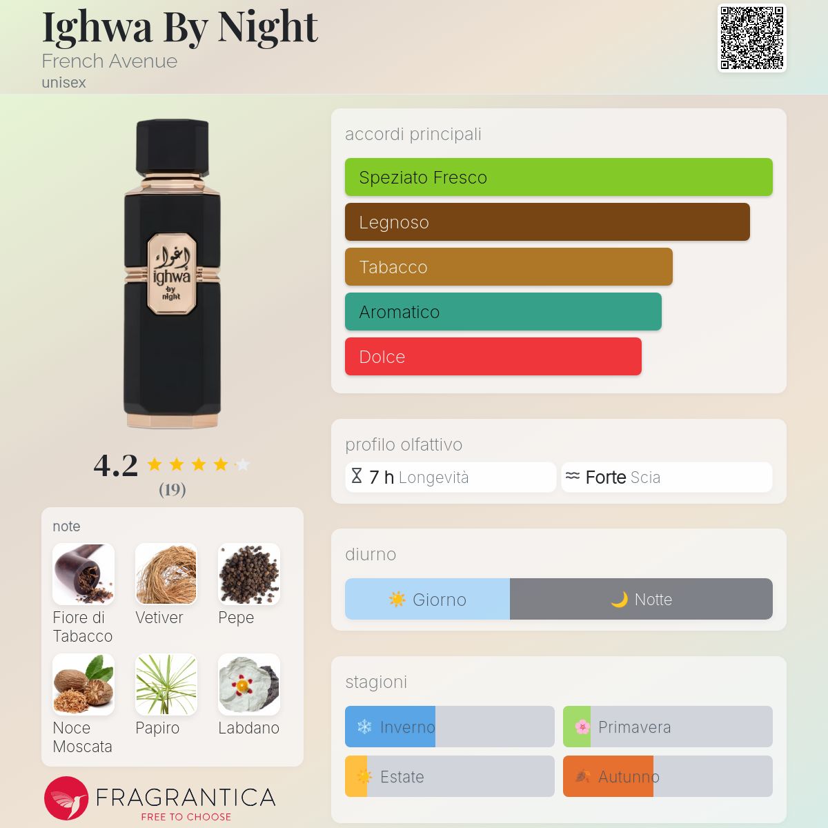 Ighwa By Night di French Avenue è una fragranza del gruppo Woody Spicy unisex. È una nuova fragranza. Ighwa By Night è stato lanciato sul mercato nel 2024. Le note di testa sono Tabacco, Pepe e Cannella; le note di cuore sono Noce Moscata, Labdano e Fava Tonka; le note di base sono Vetiver, Papiro e Vaniglia.