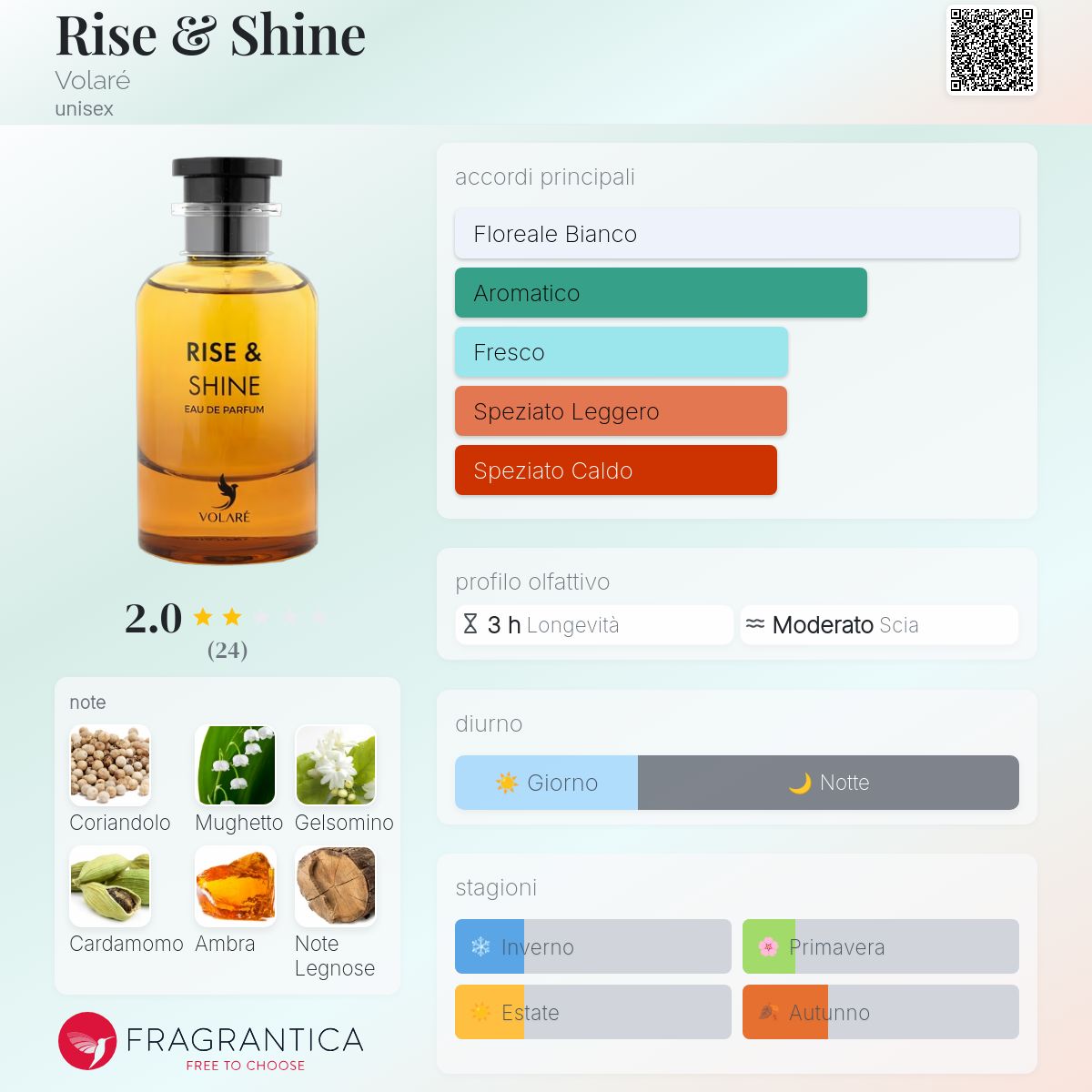 Rise & Shine di Volaré è una fragranza del gruppo Agrumato Aromatico unisex. Rise & Shine è stato lanciato sul mercato nel 2025. Le note di testa sono Coriandolo, Cardamomo, Fiore d'Arancio, Bergamotto, Mandarino e Limone; le note di cuore sono Mughetto, Gelsomino e Rosa Bulgara; le note di base sono Ambra, Legni Preziosi, Sandalo, Legno di Cedro, Muschio e Tè Verde.