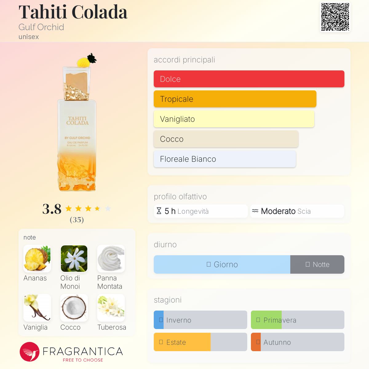 Tahiti Colada di Gulf Orchid è una fragranza del gruppo Floral Fruity unisex. È una nuova fragranza. Tahiti Colada è stato lanciato sul mercato nel 2025. Le note di testa sono Ananas, Cocco, Note acquatiche e Liquore; le note di cuore sono Olio di Monoi, Tuberosa e Cocco; le note di base sono Panna Montata, Vaniglia, Muschio e Sandalo.